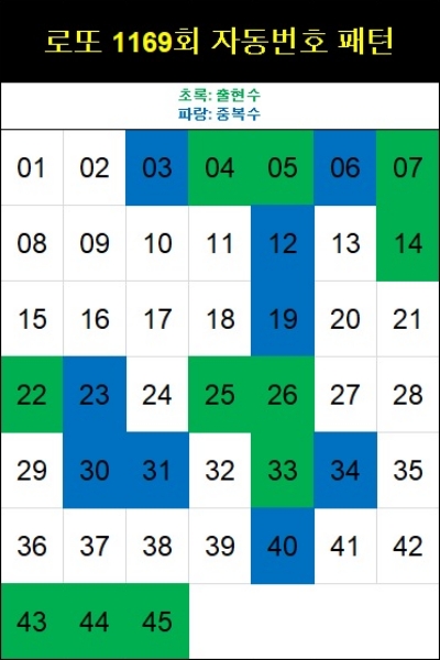 로또 1169회 자동번호의 출현 패턴을 알아봅니다.