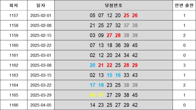 로또 1157회부터 로또 1166회까지 최근 10회를 기준으로 연속번호가 출현한 회차는 7회입니다. 그 중 로또 1166회에서는 끊이지 않던 연속번호 흐름이 끊겼습니다.
